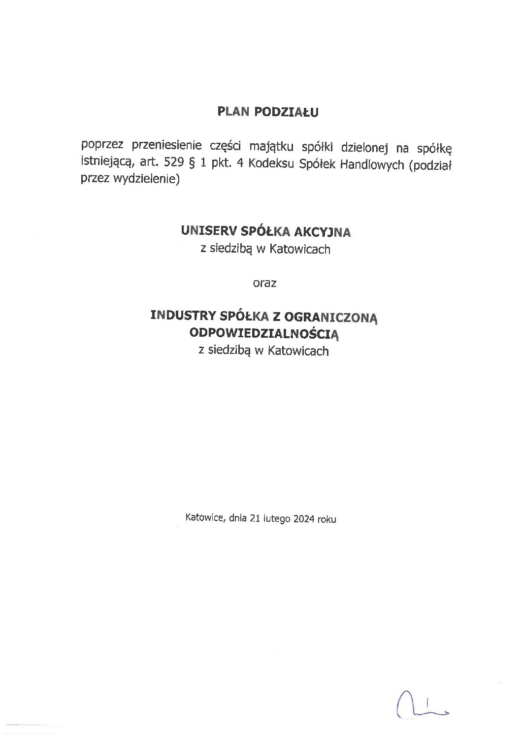 Dokumenty korporacyjne Dokumenty Uniserv S.A. do pobrania Aktualności Archiwalne Dokumenty korporacyjne Materiały korporacyjne Dokumenty korporacyjne Plan podziału Poprzez przeniesienie części majątku spółki dzielonej na spółkę istniejącą, art. 529 par. 1 pkt. 4 Kodeksu Spółek Handlowych (podział przez wydzielenie), uzgodniony 21 lutego 2024 r. (kliknij na dokument aby otworzyć plik .pdf) Strona Główna O nas Oferta Realizacje Kontakt dla Akcjonariuszy Praca Kontakt Polityka Prywatności Copyright 2019 – Uniserv S.A. | Projekt: Fooz | Wdrożenie: Media Interaktywne